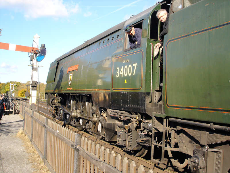 WADEBRIDGE waits for the platform starter at Sheffield Park station on 7th November 2007, whilst en route from the loco yard to her train in the other platform. On the footplate can be seen Driver Mike Lee and Dave Mitchell