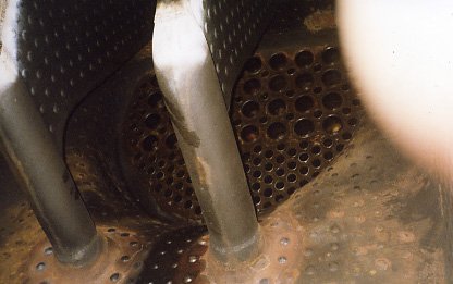 View of firebox from underneath on r/h side looking forward, showing Thermic Syphons, combustion chamber & firebox tubeplate.