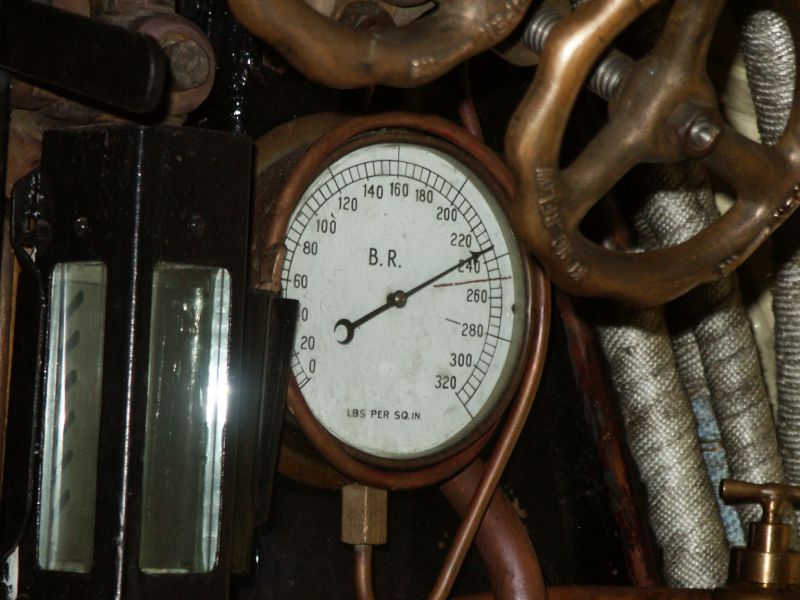 Almost there! The boiler pressure is up to 235 PSI. The red line is the present day safety valve setting of 250 PSI, the black line is for the original 280 PSI setting that the boiler had when new.Photograph © Peter Richards.