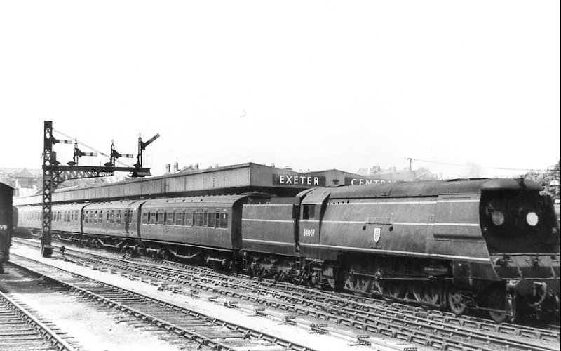 Wadebridge has arrived at Exeter Central on 25 June 1949 with the North Cornwall portion of the "Atlantic Coast Express". She is about to draw forward, taking with her the first coach (provided for passengers to Exeter), leaving the remainder to be combined with the Devon portion of the train for its onward journey to Waterloo.