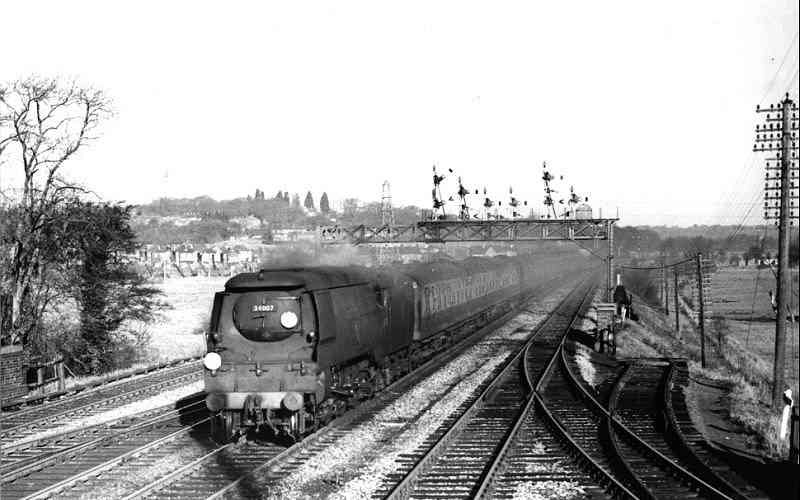 Wadebridge passing Allbrook with a Waterloo-Bournemouth train on 20 January 1958. Photographer L Elsey. Spence collection.
