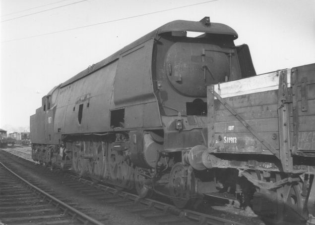 Wadebridge at Gloucester, en route to Barry Island. With coupling and connecting rods, name, class, shield, number and shed plates removed she looks a sorry sight. We do not know who the photographer was and would be delighted to find out.